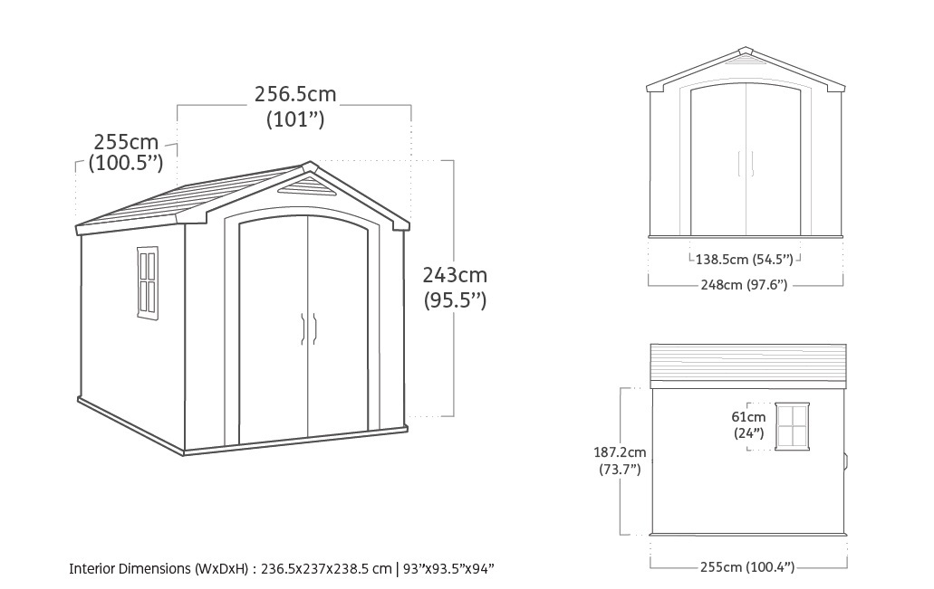 - Внешние размеры по крыше (ШхГ): 256.5 х 255.3 см