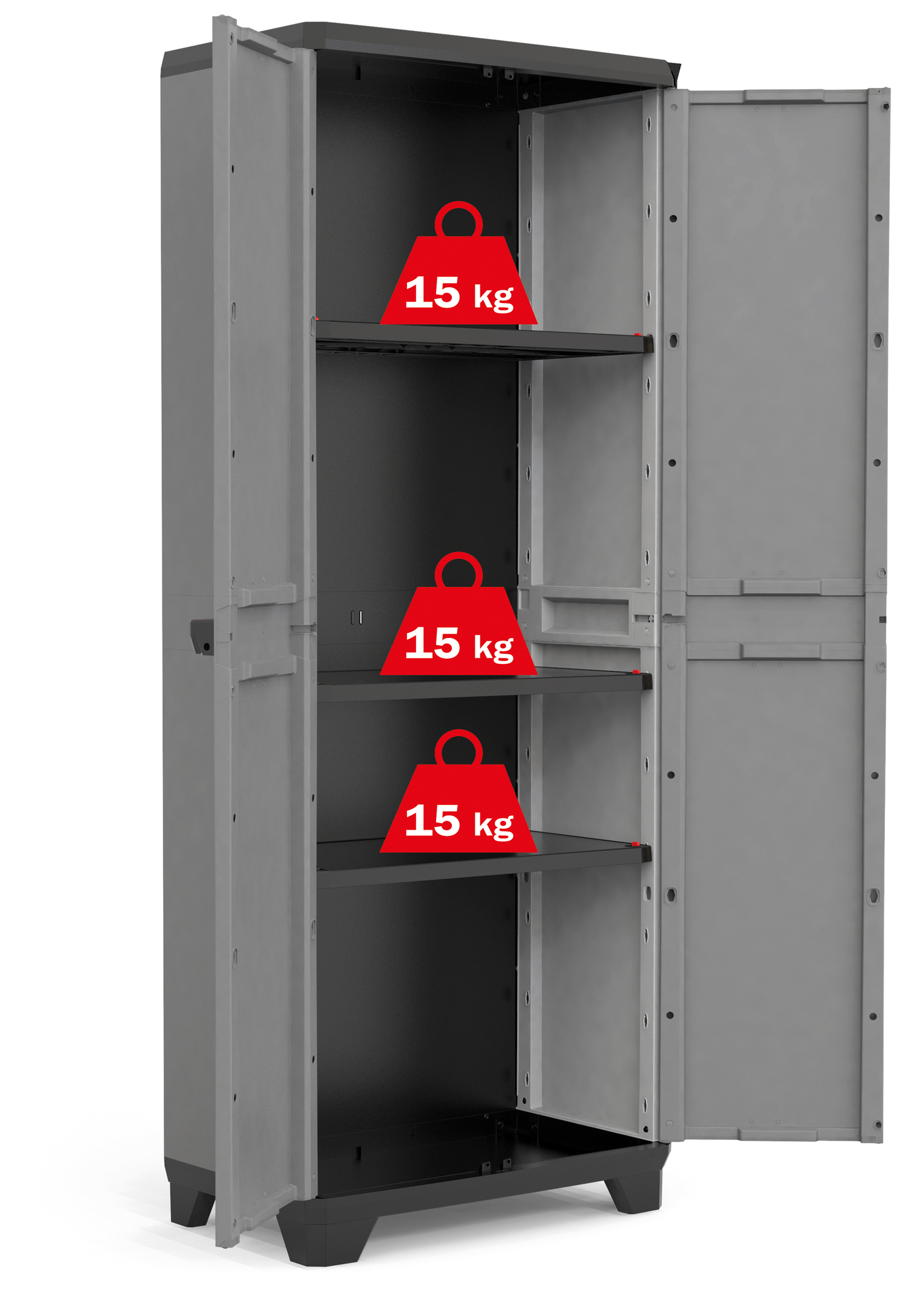 - Регулируемые по высоте 3 полки с грузоподъемностью по 15 кг (сертификат TÜV)