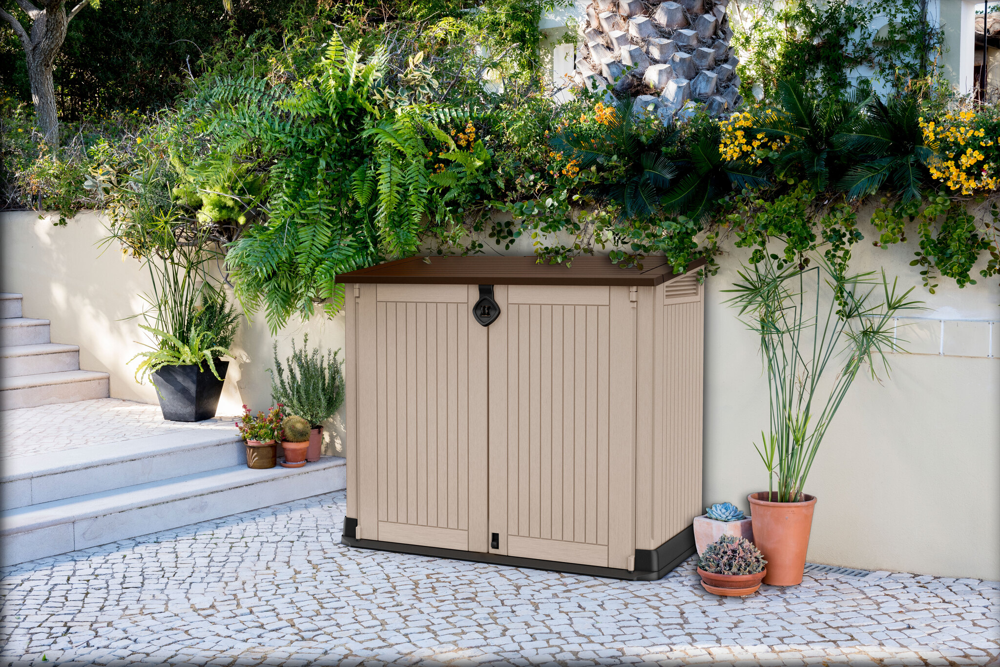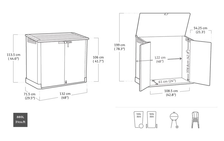 - Идеальное решение для уличного хранения садовых инструментов и оборудования, барбекю и аксессуаров или 2 мусорных баков по 120 литров на колесах.